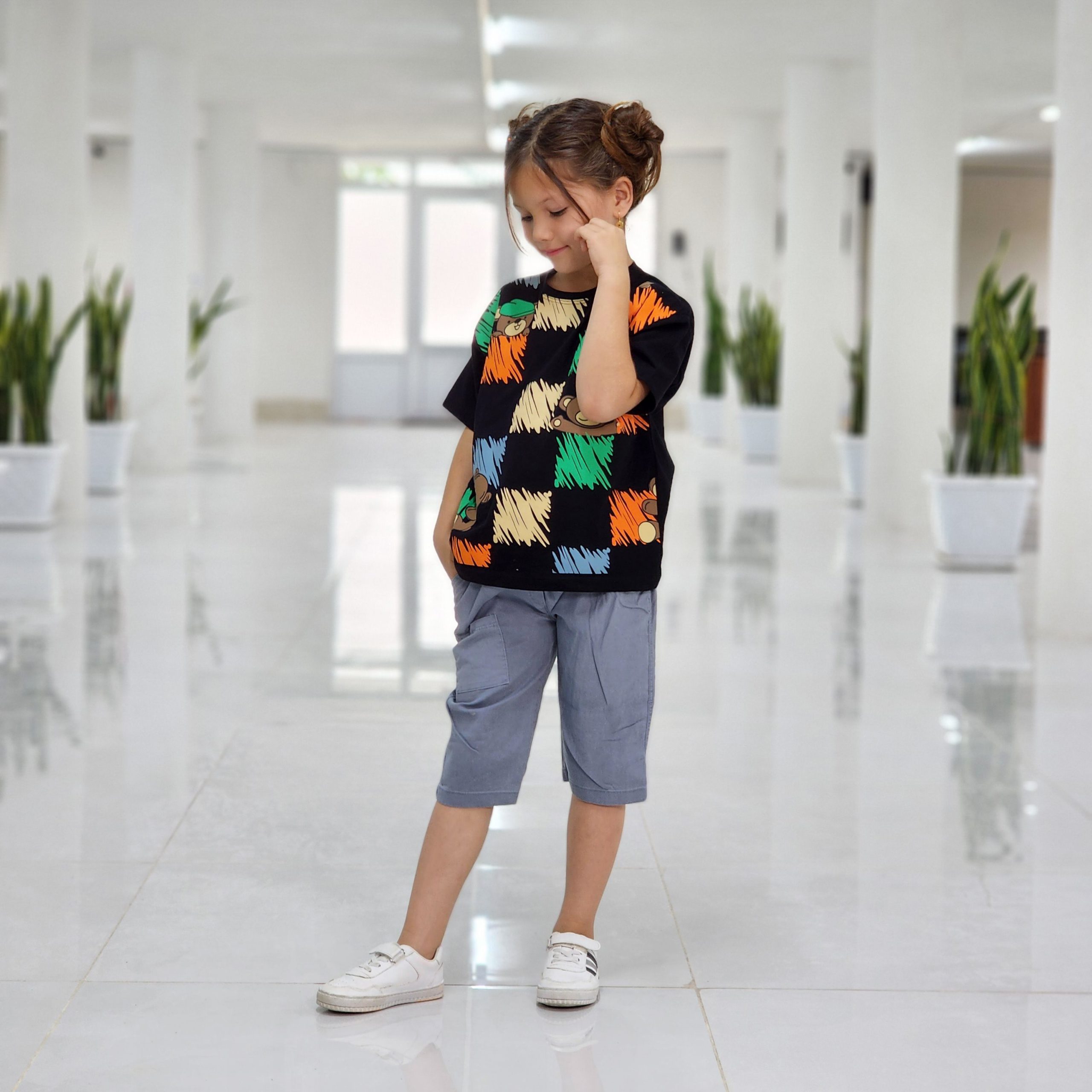 رنگبندی : تیشرت سفید و مشکی و شلوارک طوسی و نخودی ؛