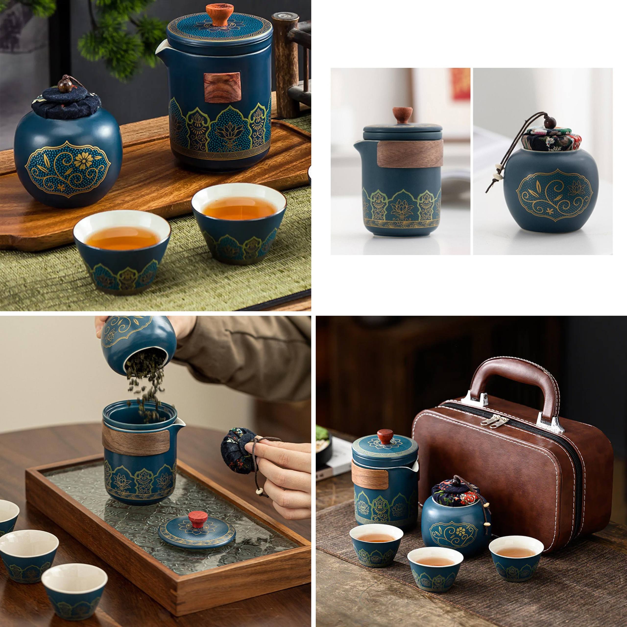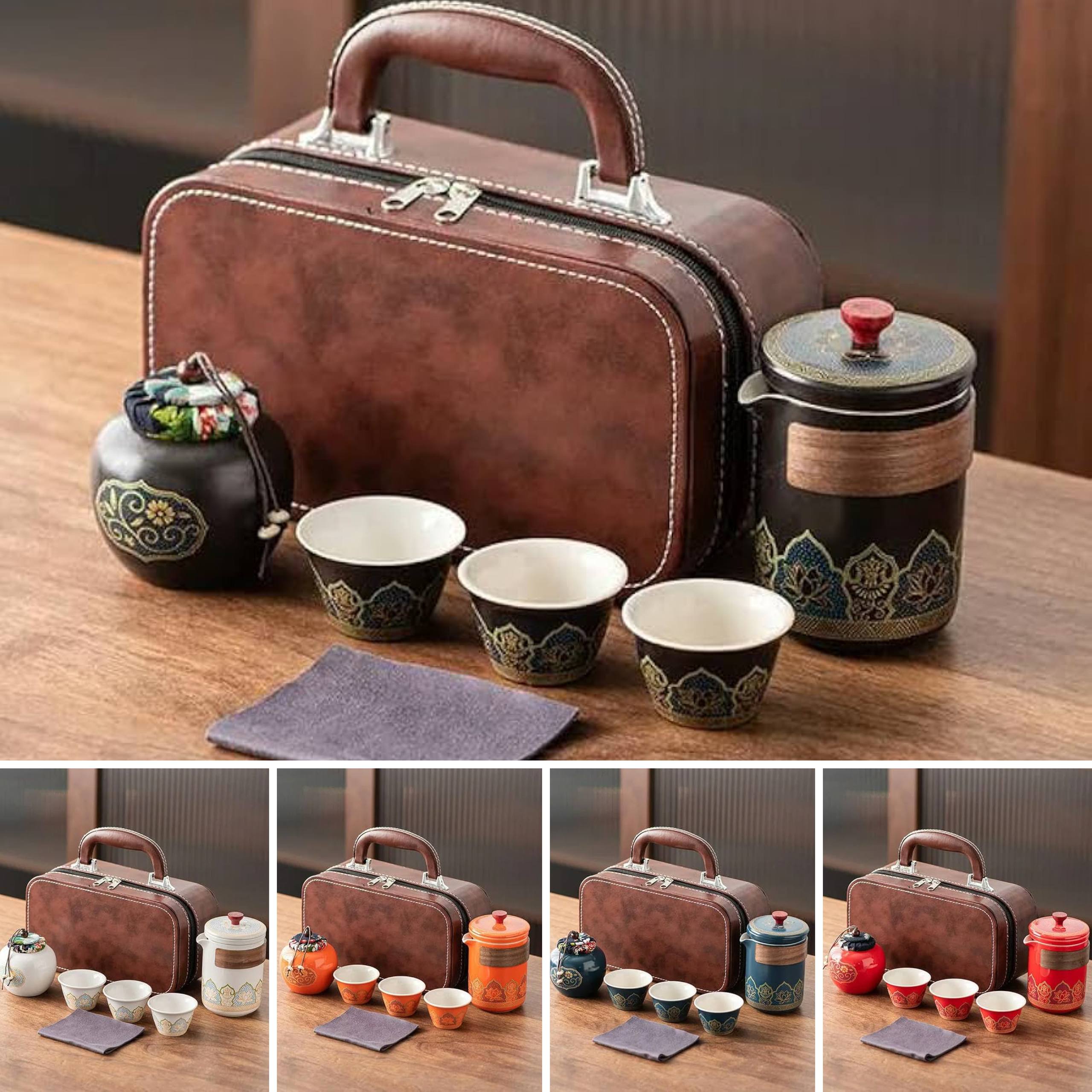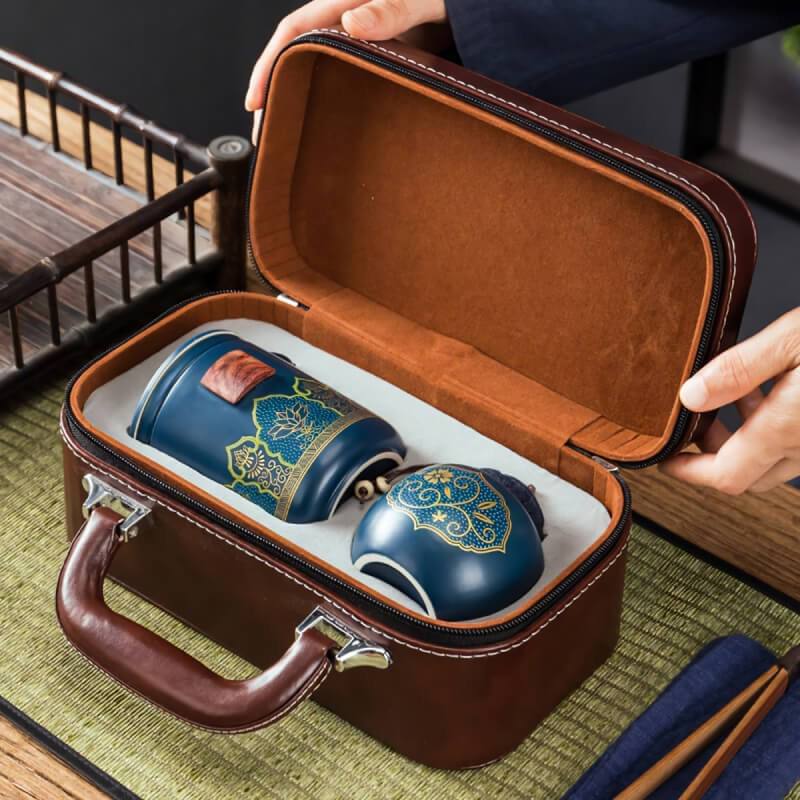 سه عدد فنجان، قوری، بانکه و کیف چرمی